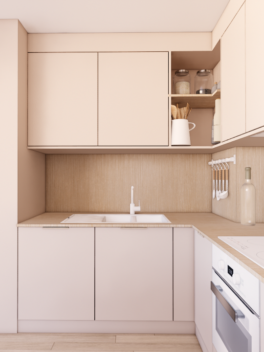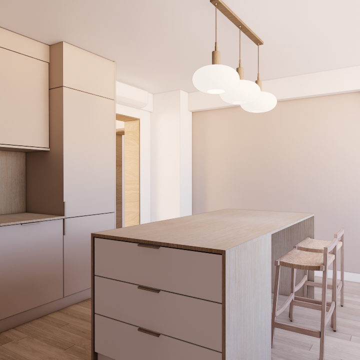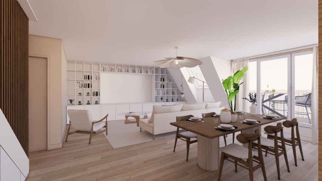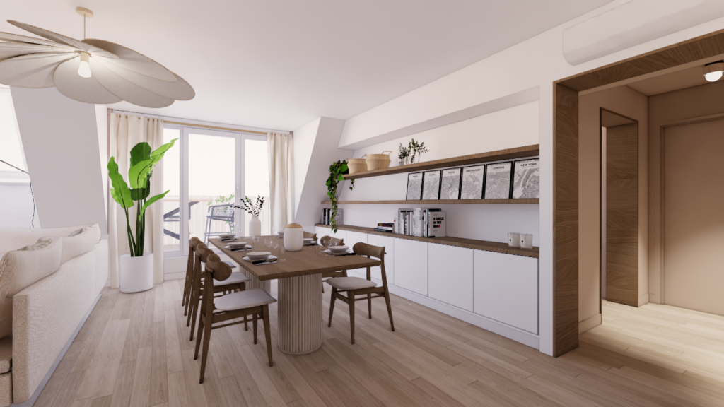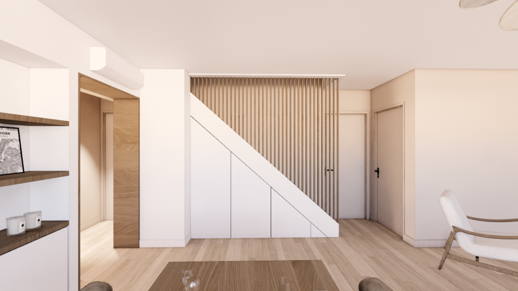 L’une des interrogations principales concernait l’ouverture de la cuisine sur le double séjour d’environ 30 m². Deux scénarios ont donc été étudiés : une version avec cuisine ouverte et une version conservant la cuisine fermée. L’étude a permis de démontrer que, dans cette configuration précise, l’ouverture n’apportait pas nécessairement un réel gain d’espace ni de fonctionnalité. La cuisine fermée s’est finalement révélée plus pertinente pour préserver l’équilibre des volumes et l’organisation du séjour. Cette réflexion illustre qu’en architecture intérieure, ouvrir un espace n’est pas toujours la solution la plus pertinente. Chaque projet nécessite une analyse précise des volumes et des usages.