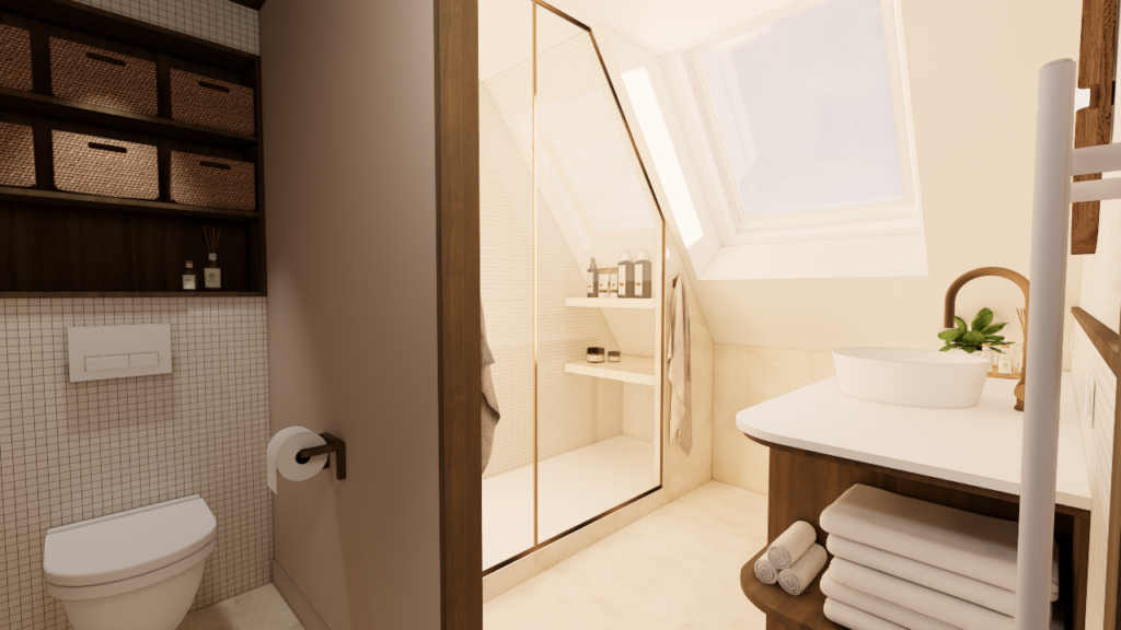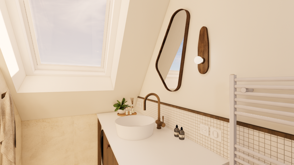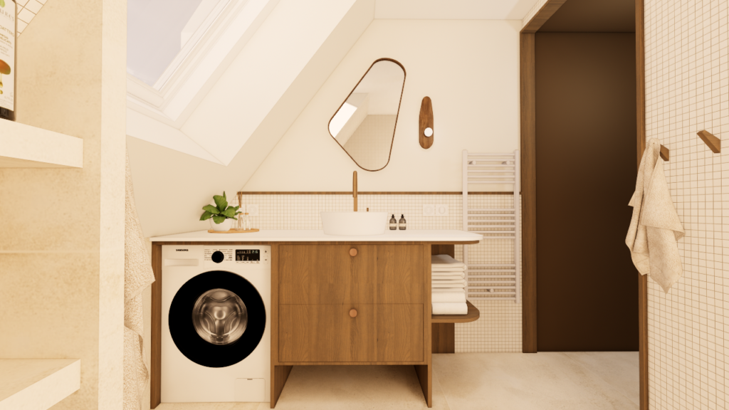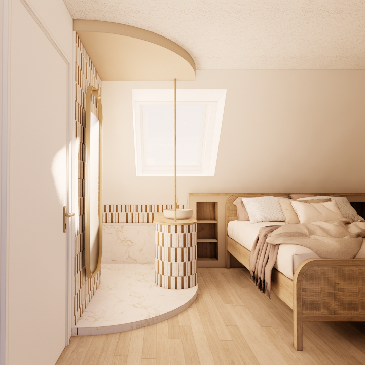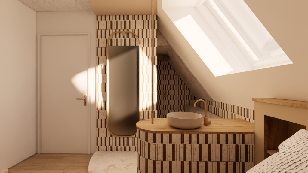 L’étage du duplex n’a pas nécessité de transformation majeure. L’intervention s’est concentrée sur l’optimisation des aménagements sous combles. La chambre de l’enfant intègre un espace de jeu et des rangements adaptés aux pentes de toiture, tandis que la chambre parentale accueille un dressing optimisé ainsi qu’un espace bureau dans la pièce adjacente, destiné au télétravail. La salle d’eau existante, contrainte par des volumes réduits, a été retravaillée dans une logique simple et efficace afin d’améliorer son usage quotidien.