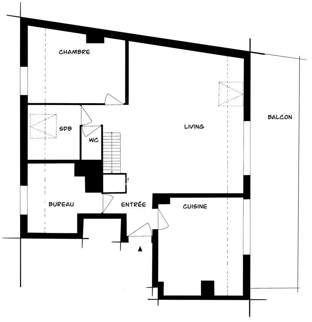Situé au dernier étage d’un immeuble construit dans les années 90 à Strasbourg, cet appartement en duplex présentait une organisation typique de son époque : un plan cloisonné, des matériaux datés et des usages qui ne correspondaient plus aux attentes actuelles des futurs propriétaires.
