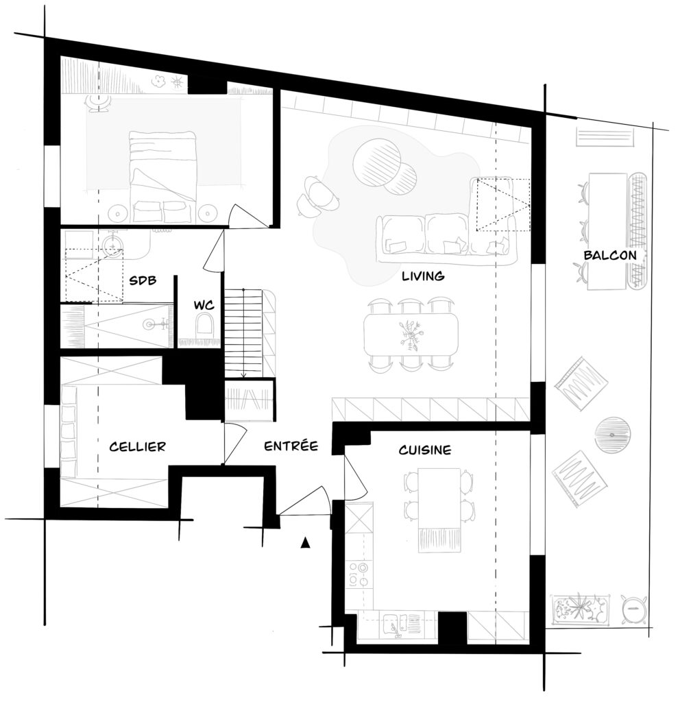 La mission confiée à MCLN Architecture consistait avant tout à accompagner les clients dans leur projection après l’achat du bien. L’objectif n’était pas de transformer radicalement l’appartement mais plutôt de comprendre comment optimiser les usages existants et redonner de la cohérence aux espaces.