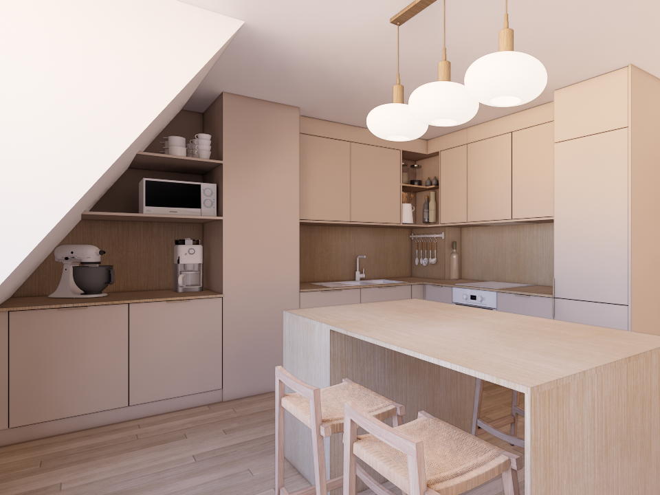 Située sous les combles, la cuisine devait composer avec la présence de nombreuses gaines techniques. Le projet a donc été conçu afin d’intégrer ces contraintes dans le dessin même du mobilier. Notre approche à permis de créer une cuisine cohérente et fonctionnelle, où chaque élément trouve naturellement sa place. Le travail en amont sur le dessin des menuiseries permet d’anticiper ces contraintes avant l’intervention d’un cuisiniste et d’assurer une continuité esthétique dans l’ensemble de l’espace.