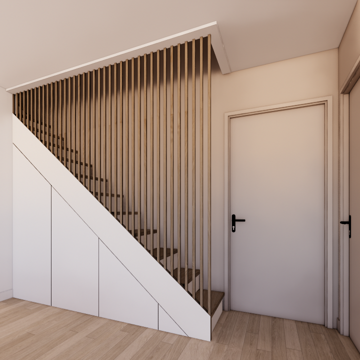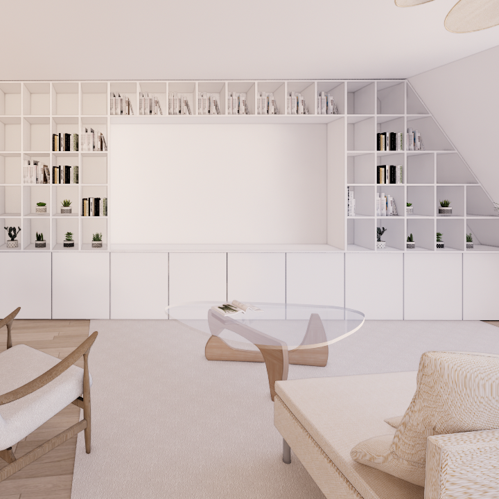 Le séjour, caractérisé par une géométrie légèrement en biais, nécessitait un travail particulier sur l’aménagement afin de structurer les fonctions sans alourdir l’espace. Plusieurs éléments de mobilier sur mesure ont été imaginés pour accompagner les usages quotidiens tout en restant accessibles à la réalisation pour les propriétaires. Les propositions combinent des modules de type IKEA avec des compléments en panneaux bois ou médium à peindre. Un meuble spécifique a également été conçu pour intégrer un système de projection vidéo souhaité par les clients, transformant le séjour en espace convivial adapté aux moments de partage.
