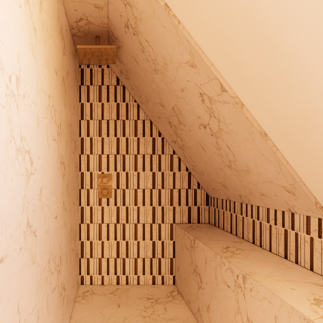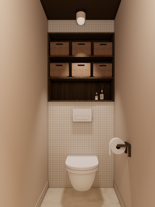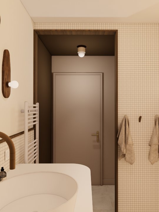 Au rez-de-chaussée, la salle d’eau et les WC ont été entièrement repensés. Les deux espaces sont réunis afin de gagner en confort tout en conservant une séparation partielle permettant de préserver l’intimité lors de l’utilisation. La zone des sanitaires est traitée comme une alcôve enveloppante, soulignée par une teinte brun foncé appliquée au mur et au plafond. Ce traitement crée une atmosphère chaleureuse et intime. L’ensemble des encadrements et éléments de menuiserie est travaillé dans un bois foncé type noyer, créant un fil conducteur dans l’appartement et renforçant l’identité du projet.