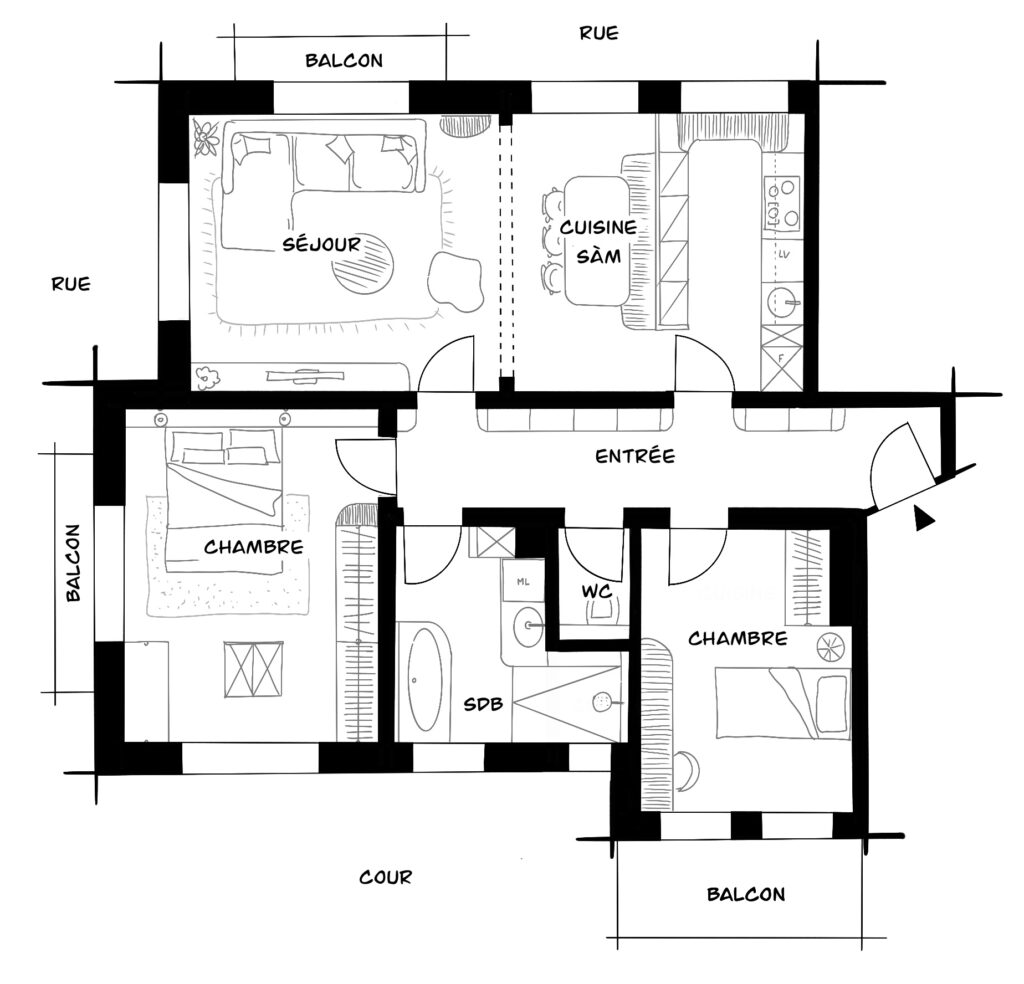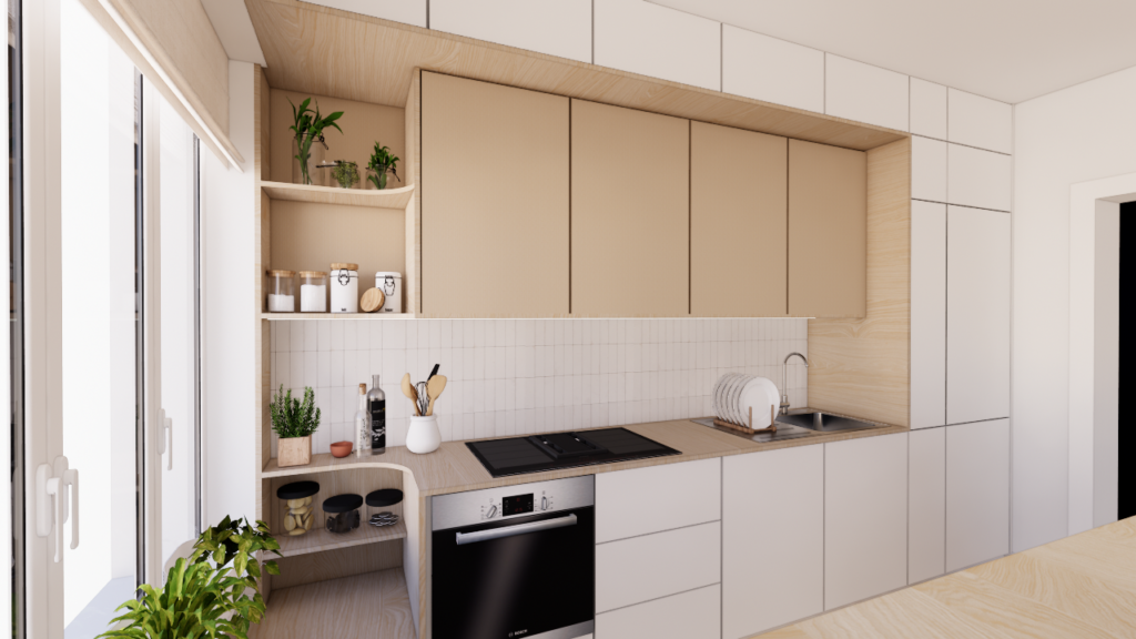 Plusieurs scénarios ont été étudiés afin de repositionner la cuisine. Cinq variantes d’implantation ont été développées pour explorer les différentes possibilités. La solution retenue consiste à déplacer la cuisine dans le double séjour afin de libérer l’ancienne cuisine pour y créer une chambre, dès l’entrée dans la pièce. La nouvelle cuisine vient naturellement structurer l’espace de vie. Implantée en fond de pièce, elle se prolonge par un bar qui organise la transition avec la salle à manger. La configuration particulière des fenêtres, très basses, ne permettait pas d’y prolonger directement le bar. Le projet propose donc une alcôve intégrant un banc et des rangements afin d’optimiser l’espace tout en accompagnant la présence des ouvertures. Sur le long mur, un linéaire de cuisine sur mesure vient structurer la pièce. Son extrémité adopte une forme légèrement arrondie afin de s’adapter à la fenêtre sans rompre la continuité du mur. L’ensemble compose une cuisine compacte, fonctionnelle et conviviale, pensée pour accueillir autant les usages du quotidien que les moments de partage.