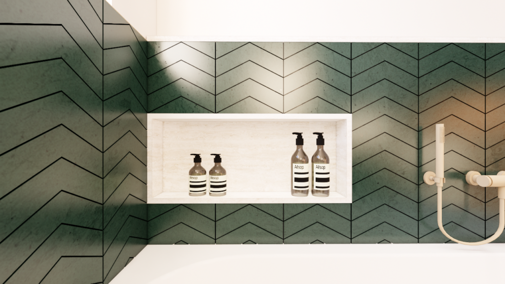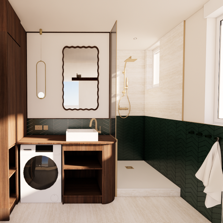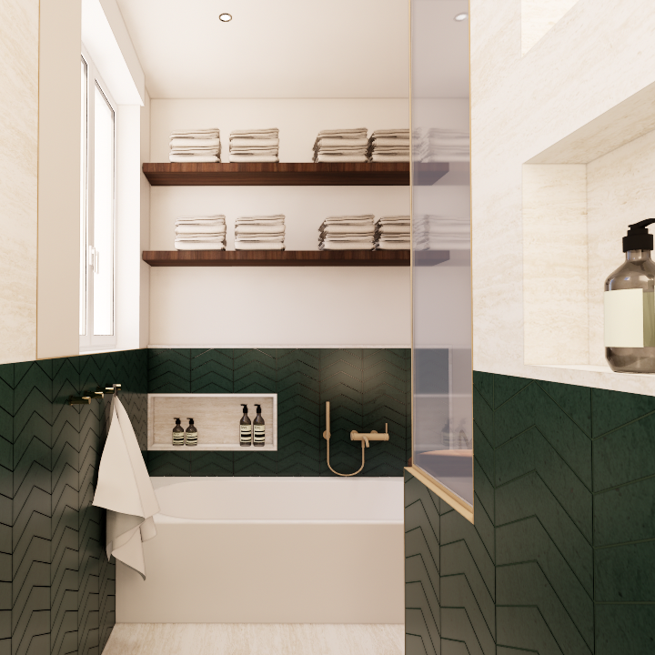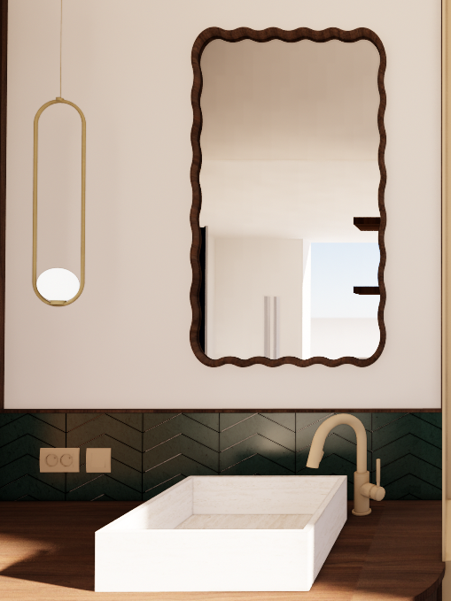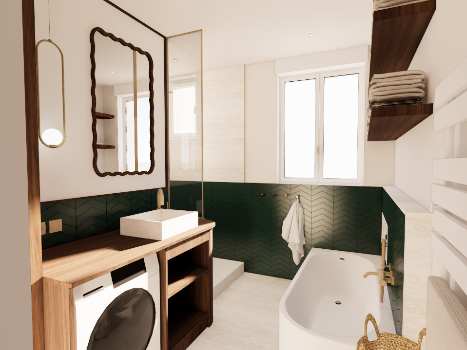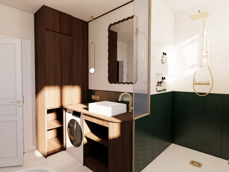 Alors que les espaces de vie privilégient une palette sobre de blancs et de beiges, la salle de bain accueille une ambiance plus affirmée. Un carrelage vert sapin posé en chevrons forme un soubassement graphique, associé à un revêtement minéral beige inspiré du travertin. La robinetterie et les luminaires en laiton brossé viennent réchauffer l’ensemble. Un miroir aux formes ondulées adoucit les lignes de la pièce et dialogue avec les meubles sur mesure aux angles arrondis.