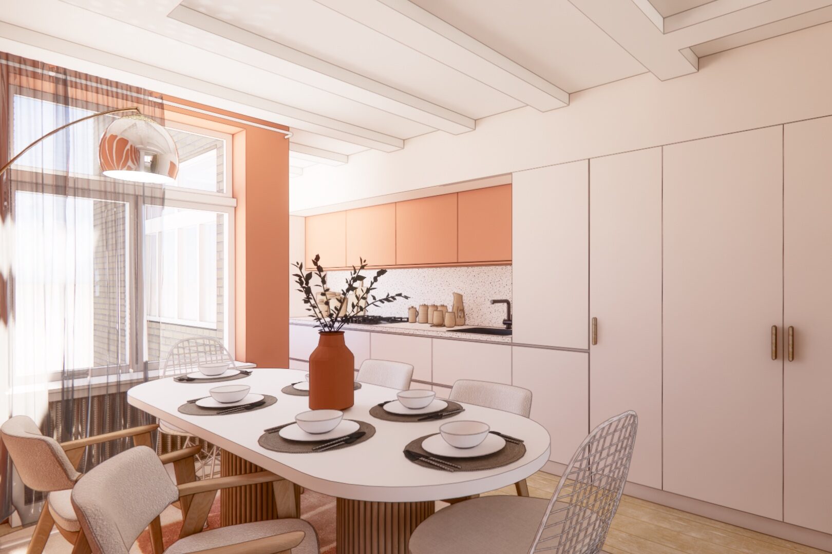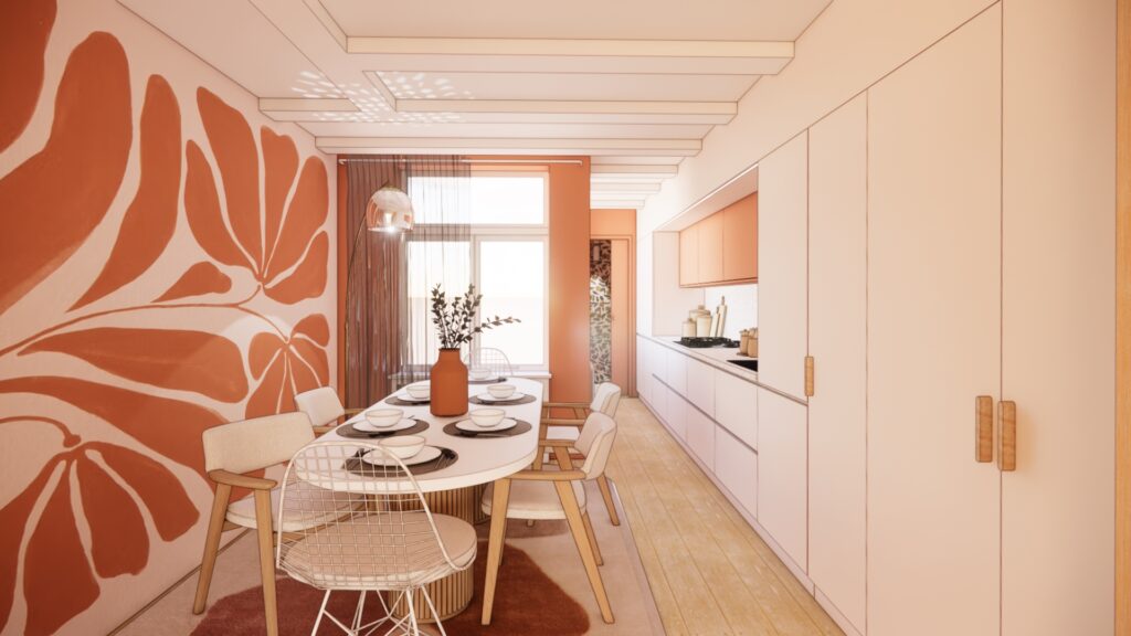 Le projet s’appuie sur les qualités existantes du lieu — poutres apparentes, parquet ancien, lumière traversante — tout en les révélant par une palette chromatique douce et chaleureuse.