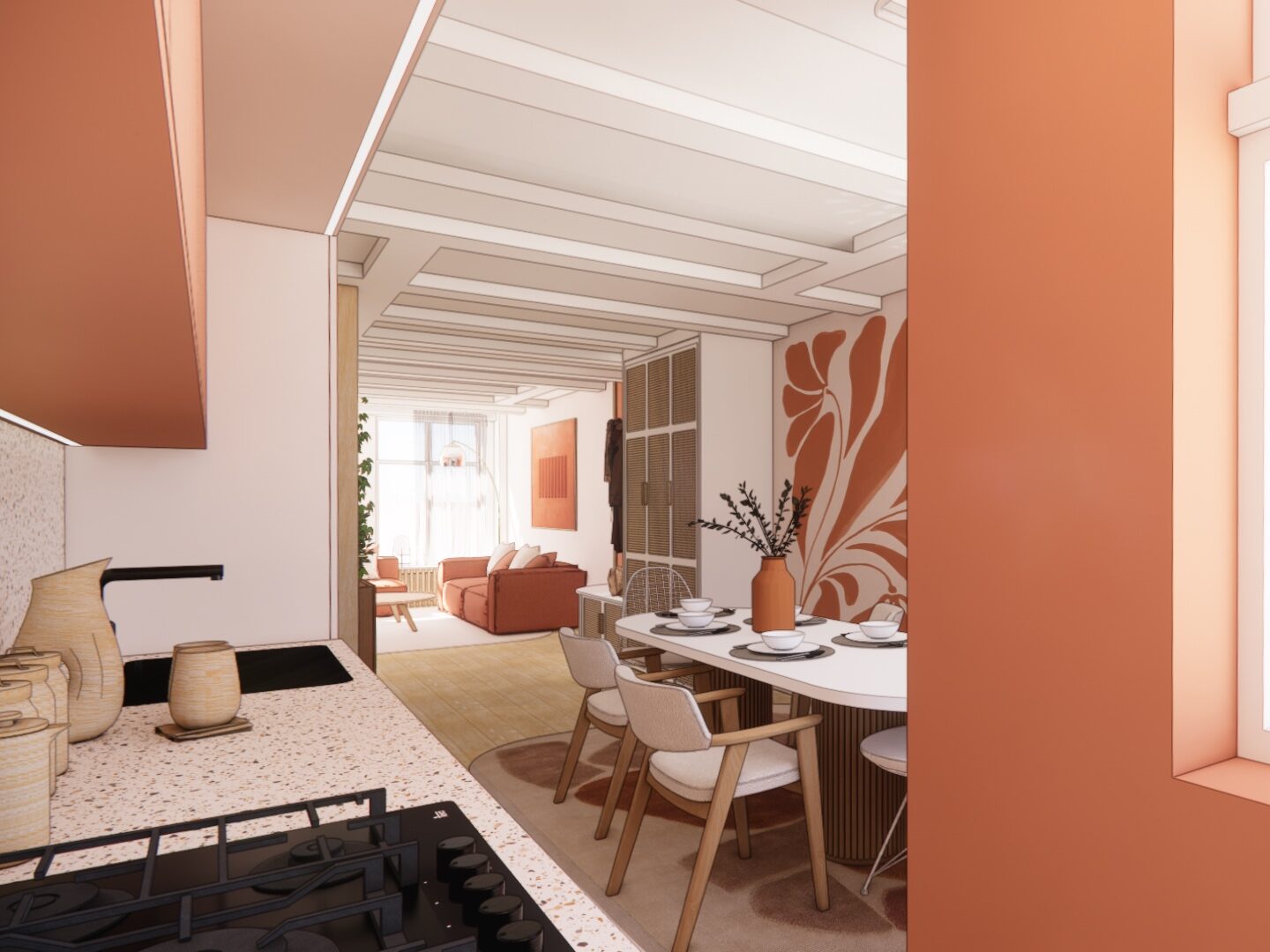 Les tons terracotta et beige structurent les espaces et créent une continuité visuelle, tandis que les matériaux naturels — bois, cannage, terrazzo — apportent texture et authenticité.