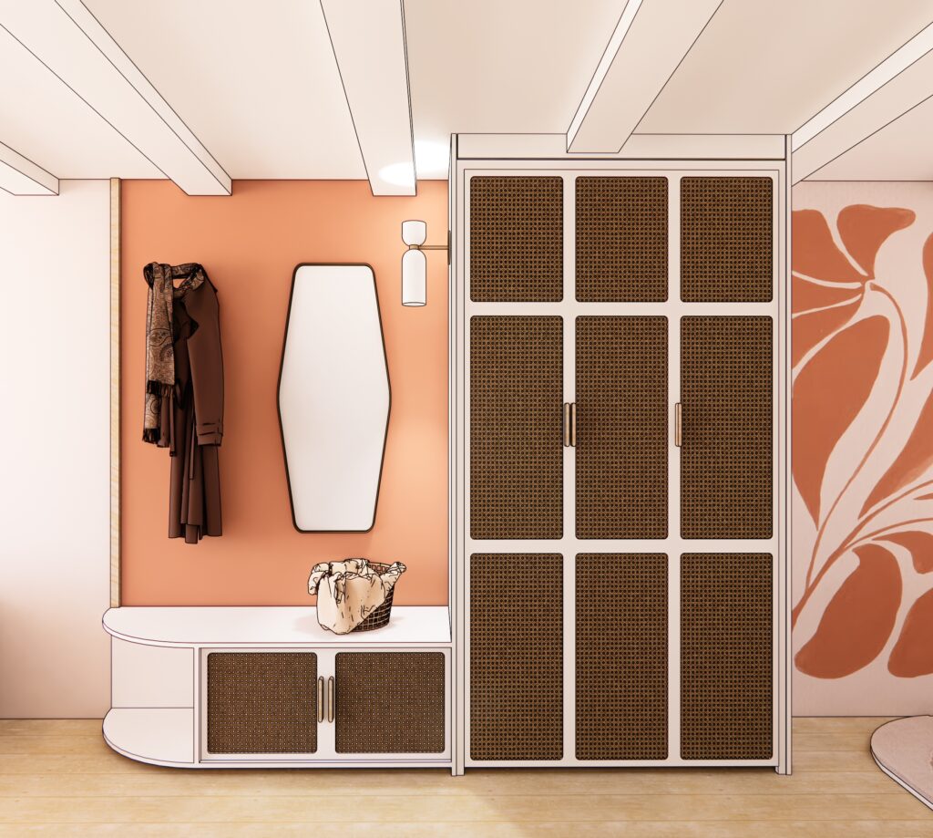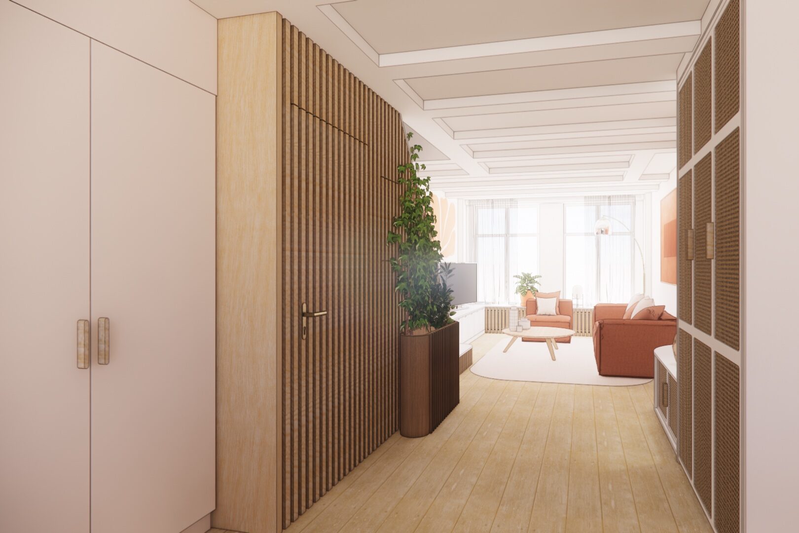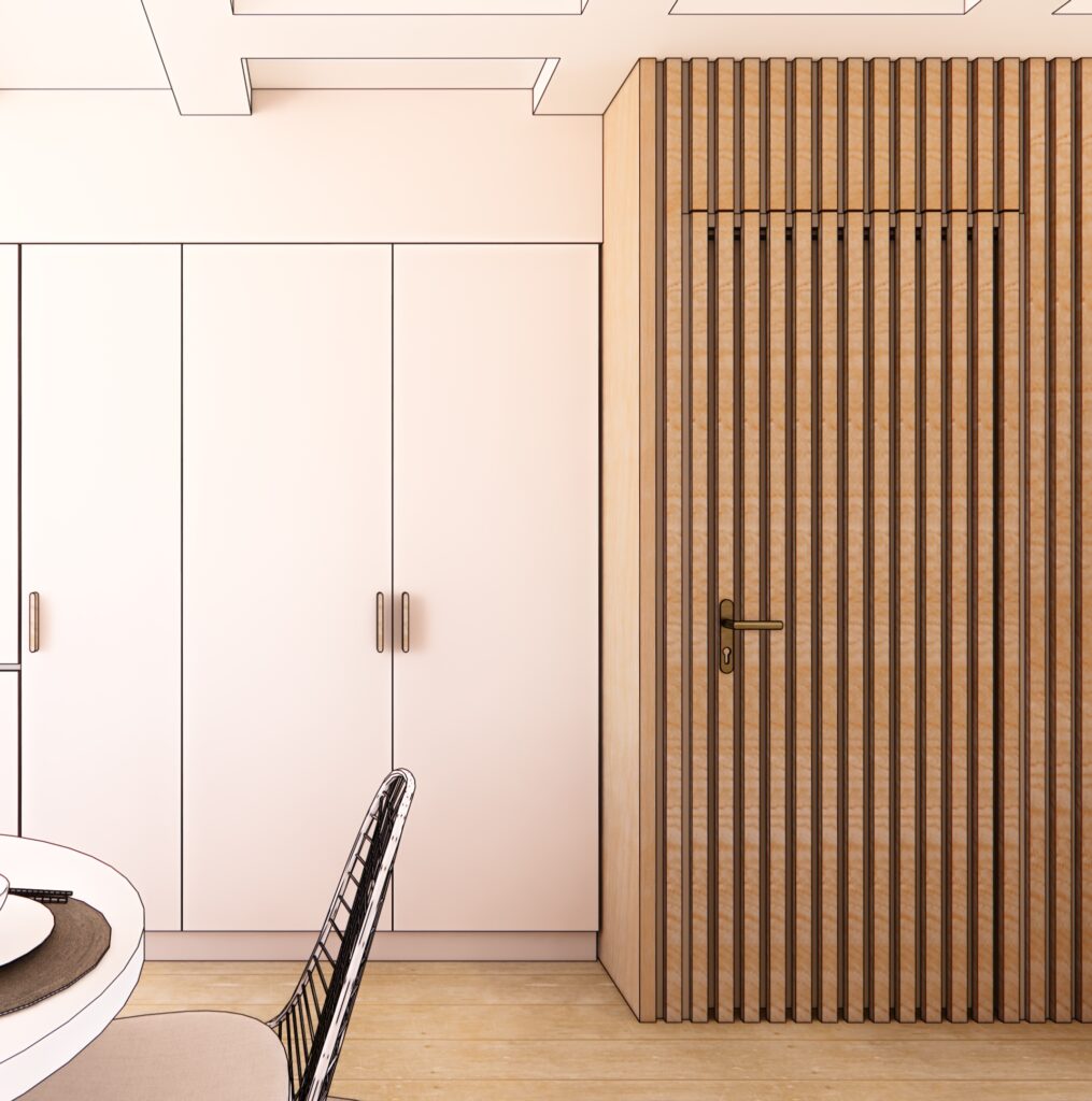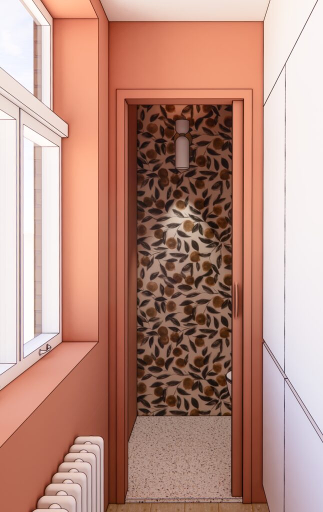 Ce repositionnement, en supprimer le placard d’entrée trop profond, a permis d’ajouter des rangements intégrés et de rendre l’espace plus fonctionnel sans en modifier la perception.