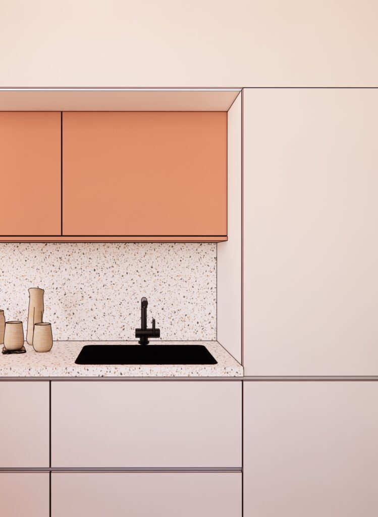 La cuisine existante a été entièrement repensée : elle conserve sa position initiale mais se raccourcit d’un mètre pour intégrer un WC invité dissimulé par une cloison coulissante.