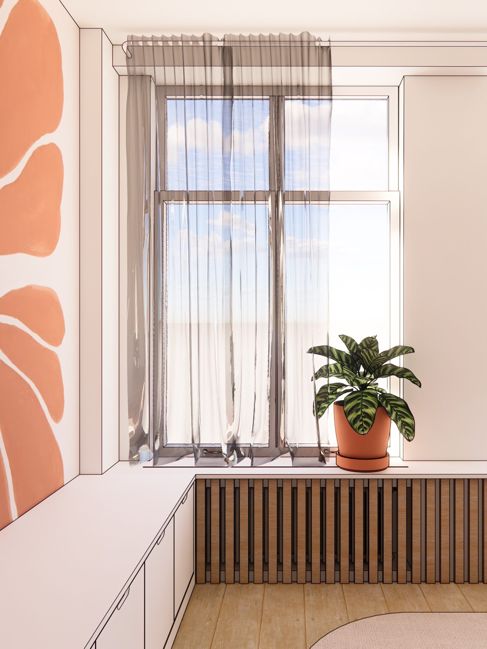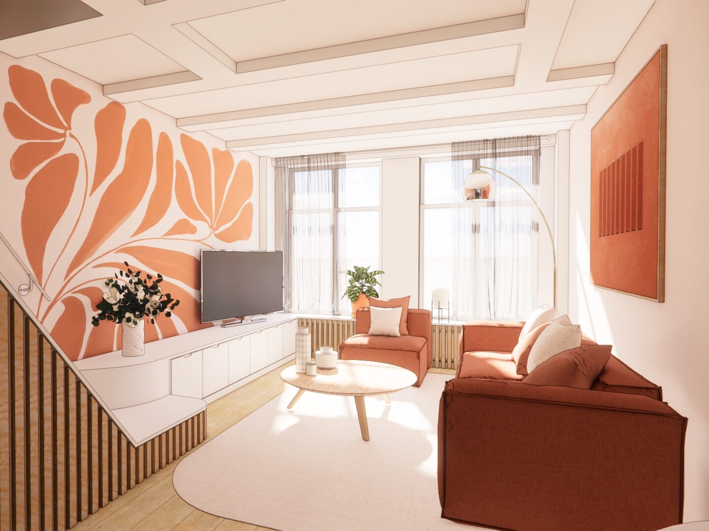 Ce nouvel agencement est complété par un meuble télé sur mesure, prolongeant la tablette du radiateur existant et renforçant la cohérence d’ensemble.