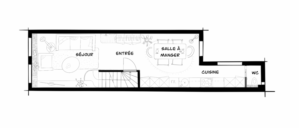 L’intervention s’est concentrée sur le rez-de-chaussée du logement, soit 50 m², avec pour objectif de clarifier les usages, optimiser le rangement et apporter plus de fluidité au quotidien.