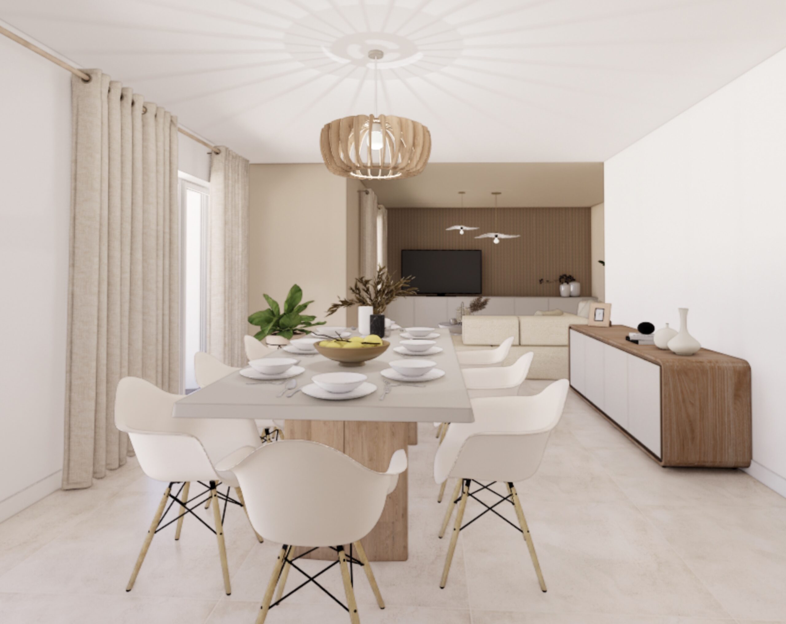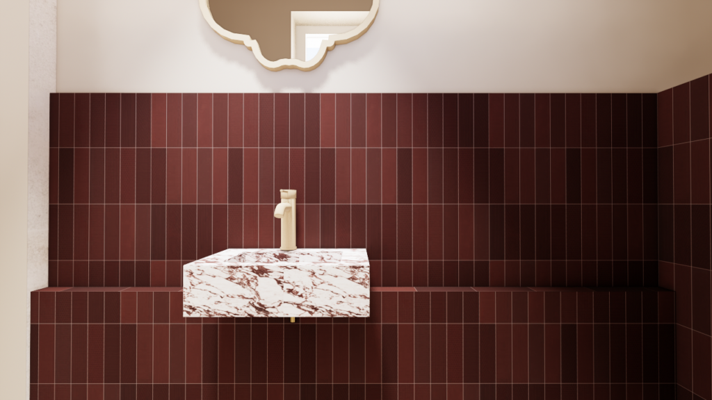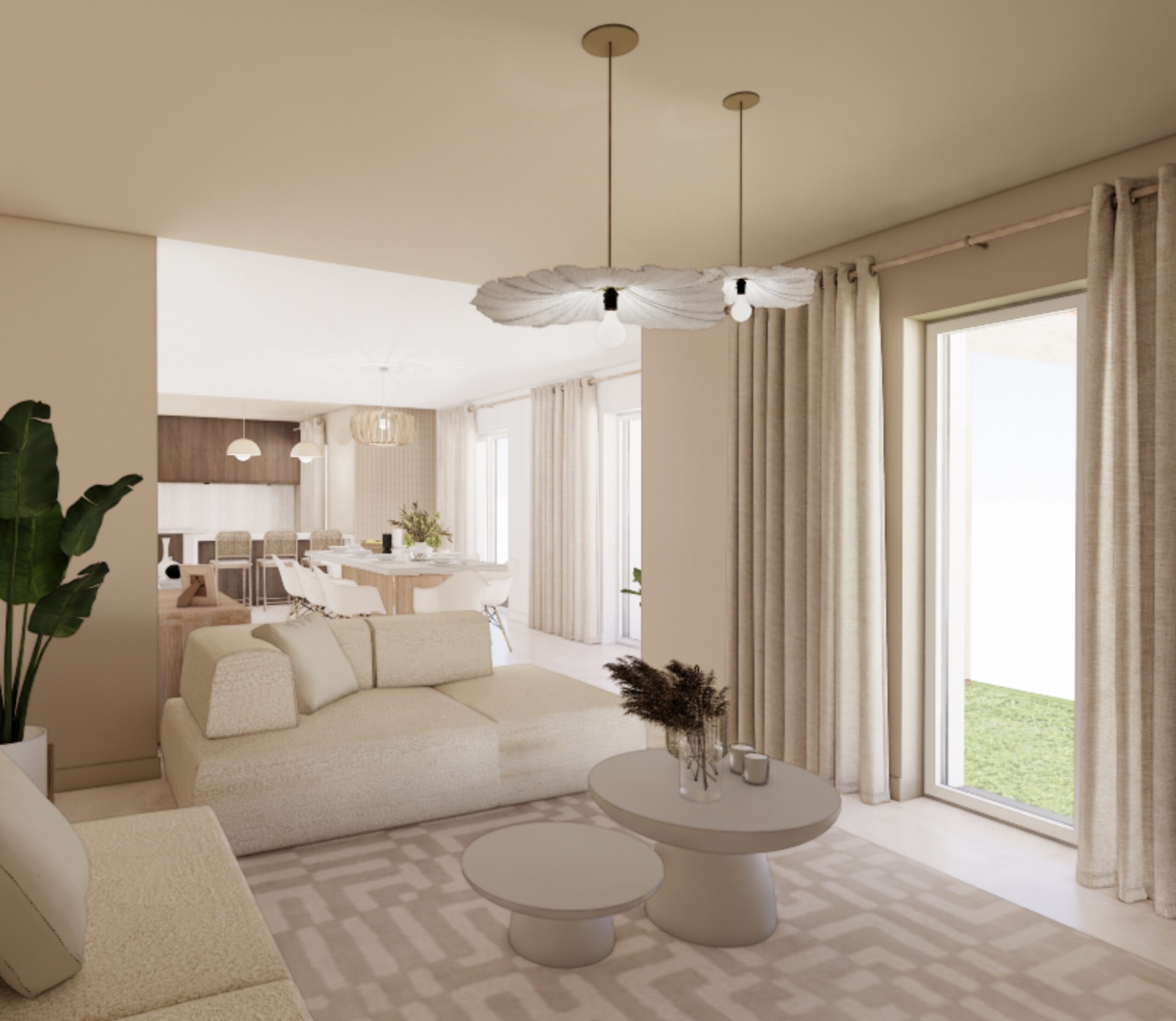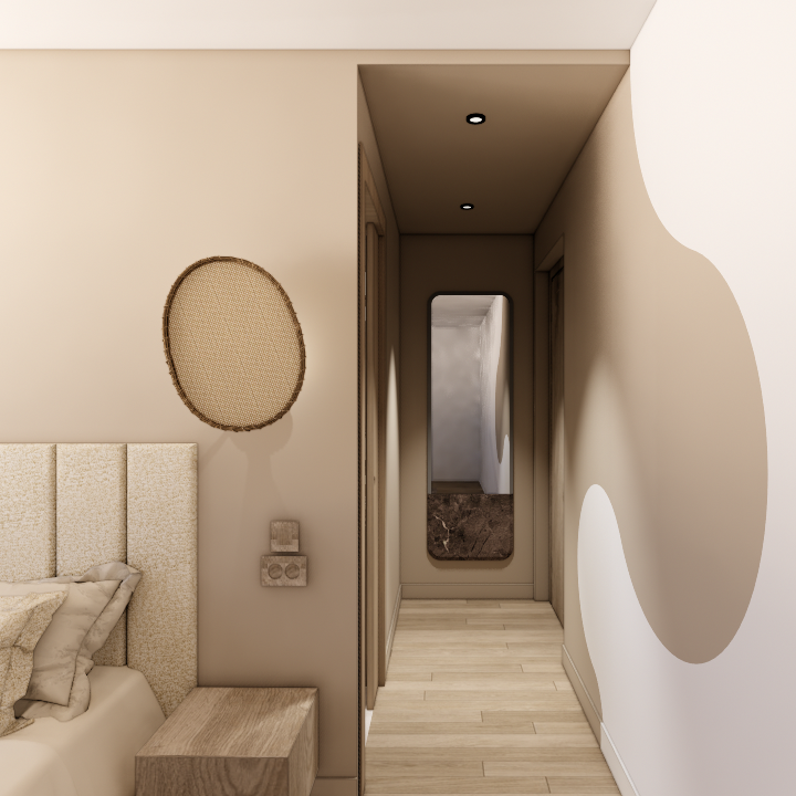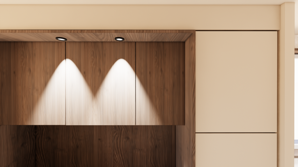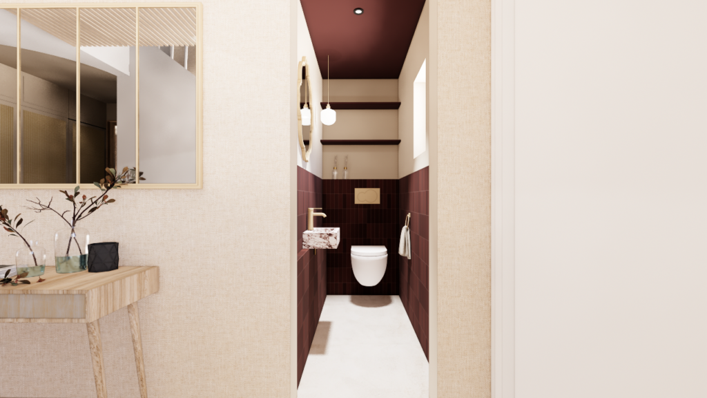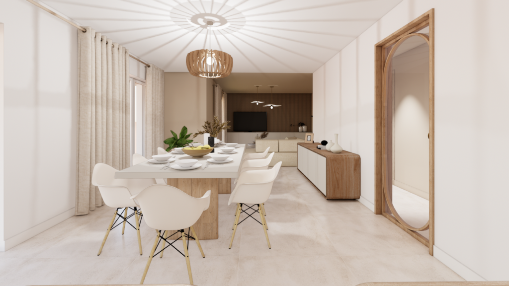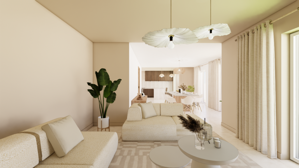 La maison bénéficie d’une configuration particulière : trois façades en léger retrait créent naturellement une hiérarchie des volumes entre cuisine, salle à manger et salon. Plutôt que de gommer cette singularité, le projet s’appuie sur cette géométrie pour organiser les espaces tout en les reliant visuellement. Les trois fonctions — cuisine, salle à manger et salon — forment désormais un ensemble continu, rythmé par des color blocks dans des tonalités beiges appliqués aux murs et aux plafonds afin d’ancrer visuellement chaque espace.