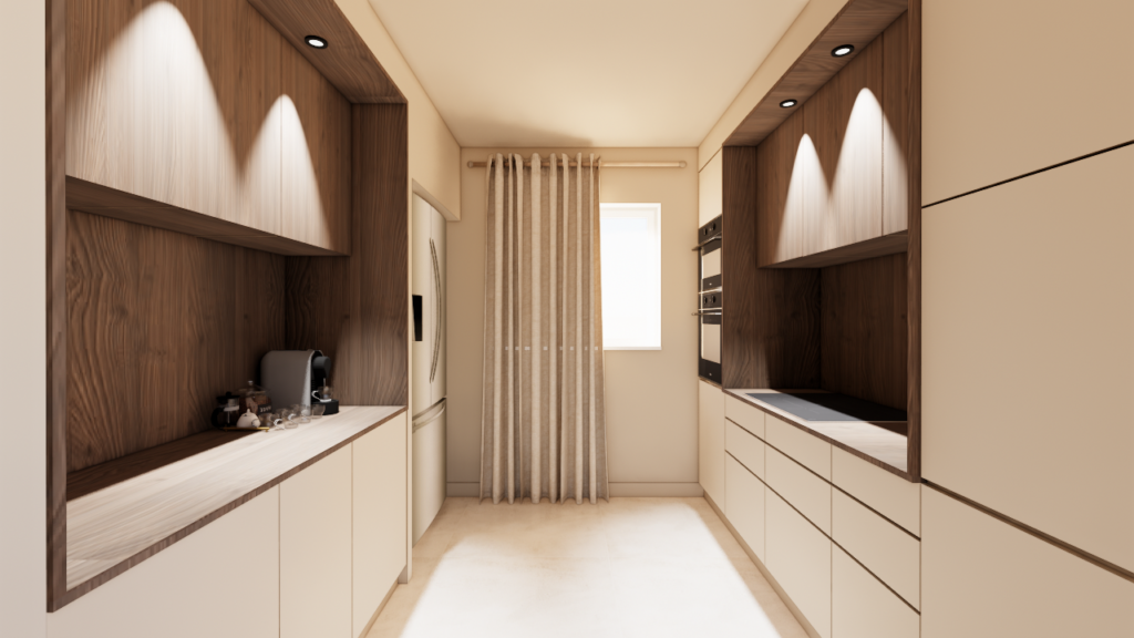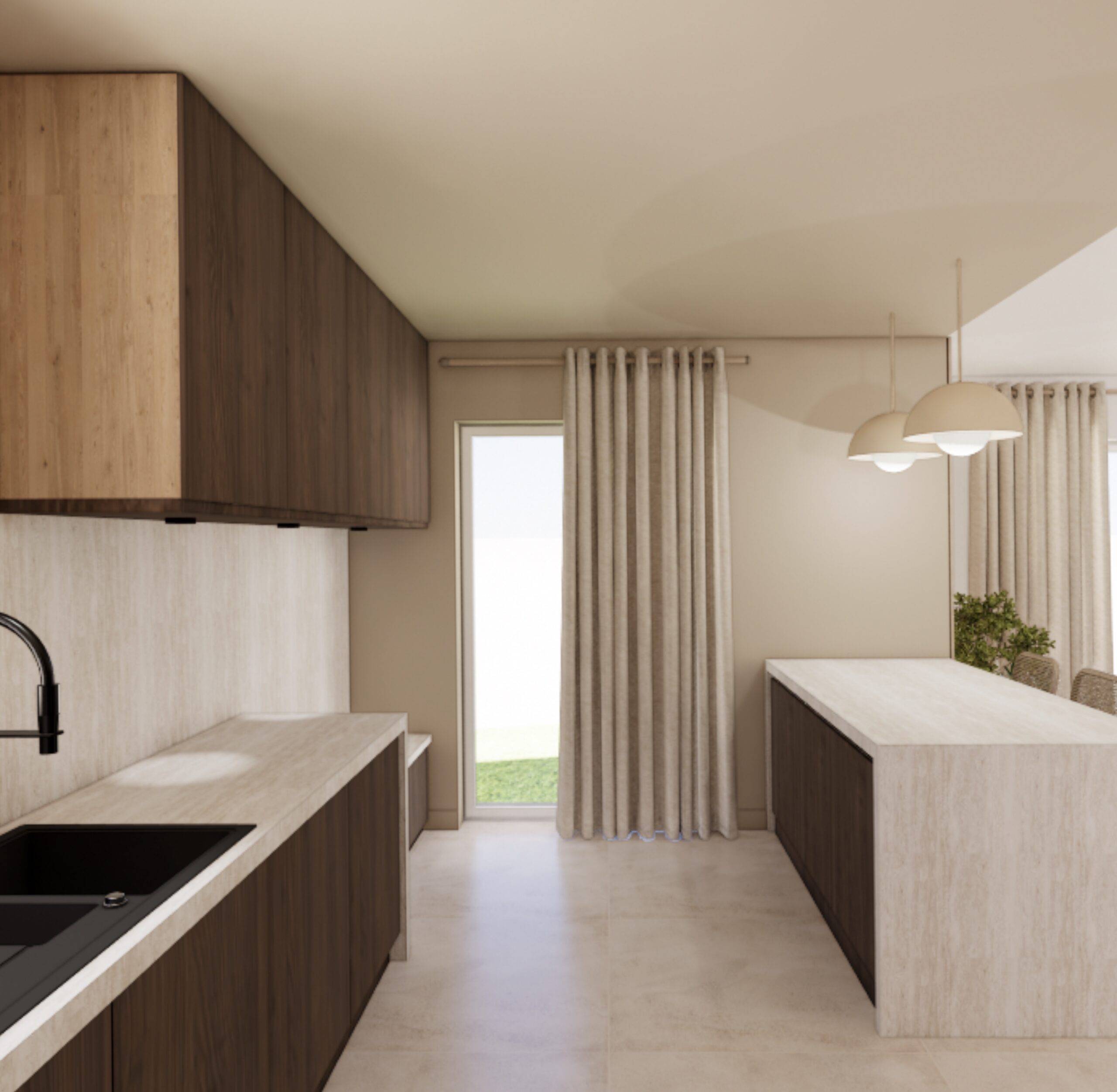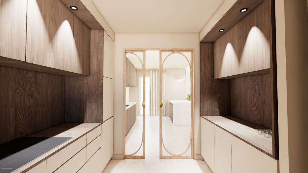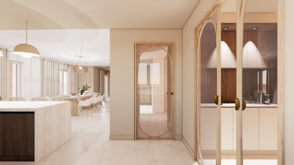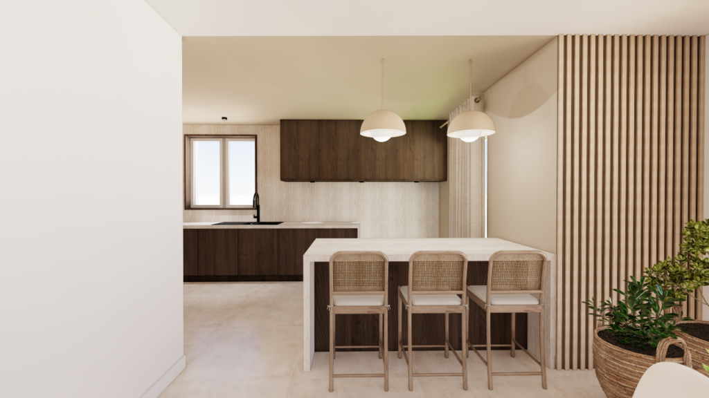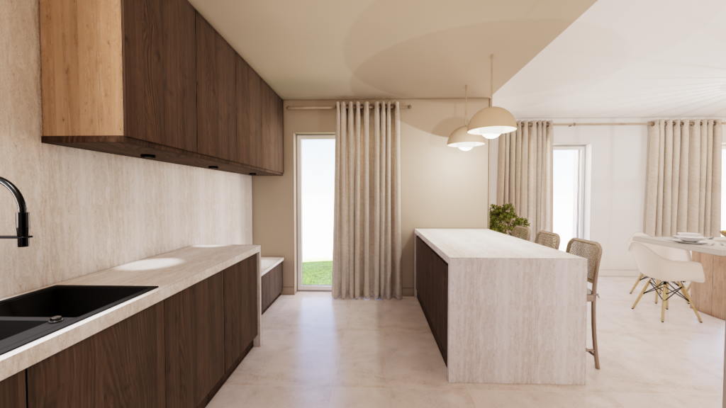 Une arrière-cuisine accueille désormais les fonctions techniques : cuisson, coffee corner et électroménager. Cet espace peut être fermé à terme par des baies vitrées coulissantes afin de maîtriser les odeurs et les nuisances sonores. La cuisine principale, ouverte sur la salle à manger et le salon, devient un lieu de convivialité. Elle s’organise autour d’un point d’eau et d’un bar destiné aux moments de partage. Un banc avec rangements est intégré devant la baie vitrée, renforçant le caractère chaleureux de l’espace.