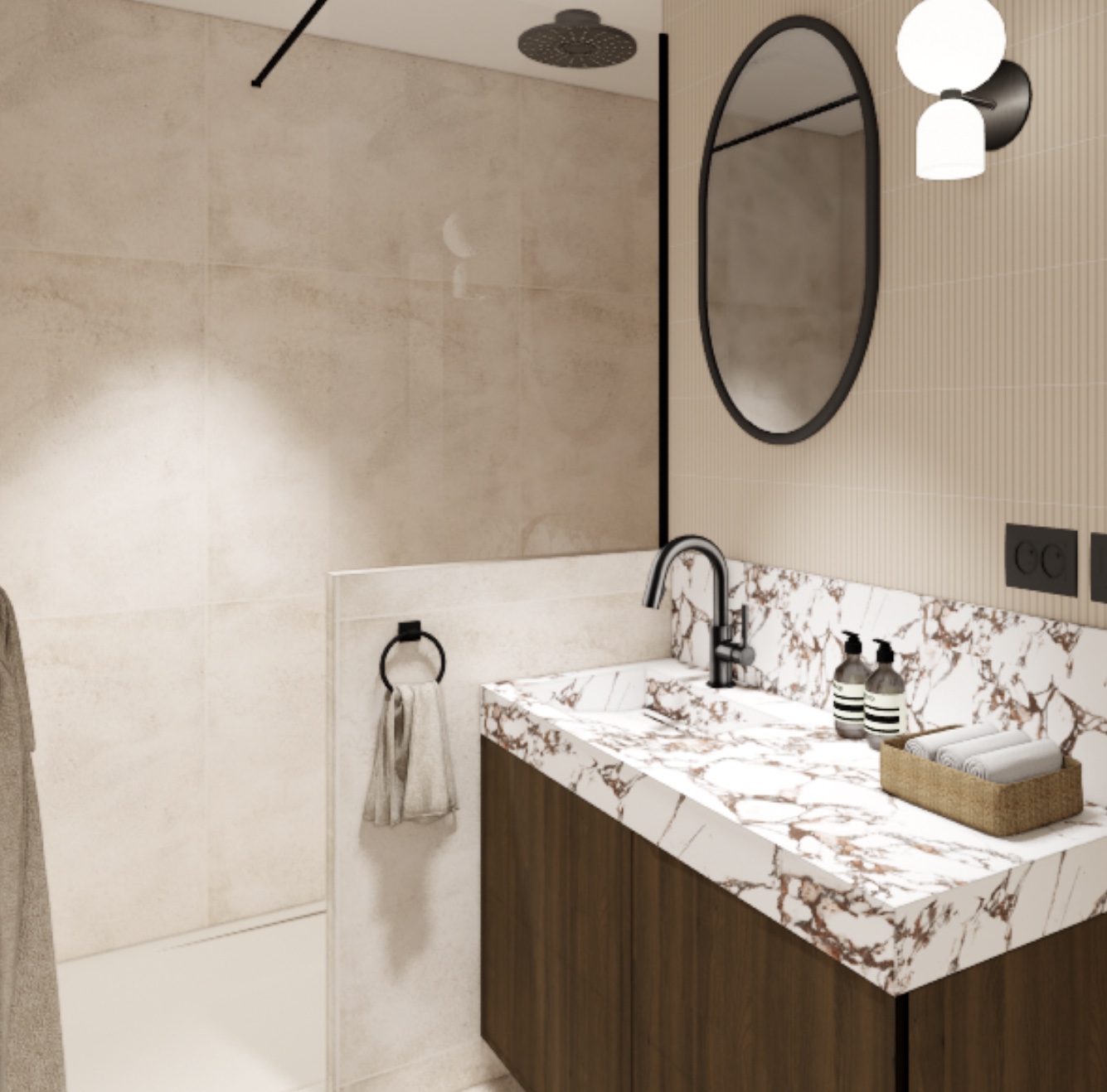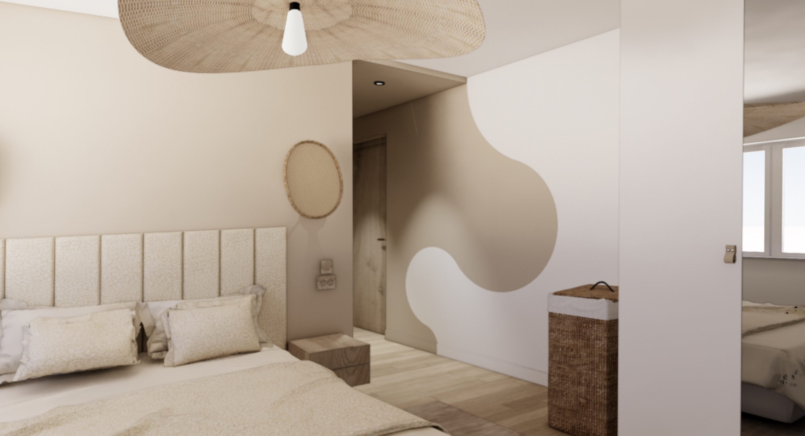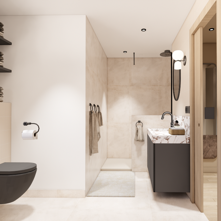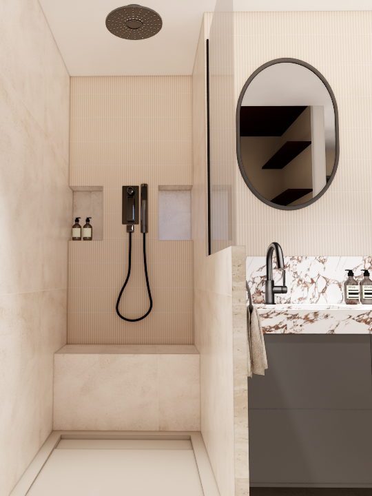 La petite salle d’eau existante, attenante à la chambre, est repensée afin de créer une véritable suite parentale. Les cloisons sont ajustées pour intégrer un WC, une douche généreuse avec banc et douche pluie encastrée au plafond. La chambre, d’une surface supérieure à 20 m², permet d’intégrer les rangements existants des propriétaires tout en accueillant un nouvel aménagement de tête de lit sur mesure.