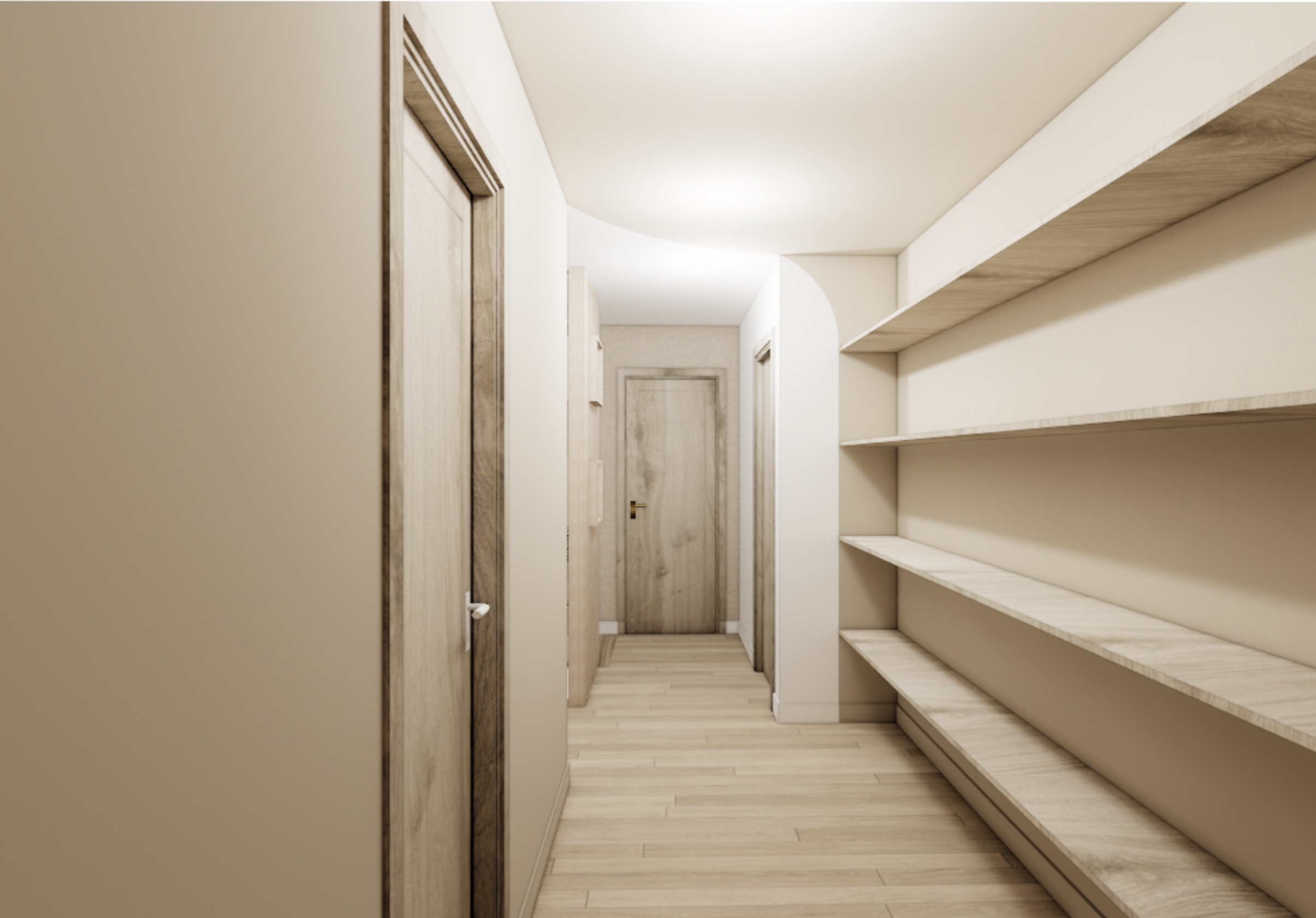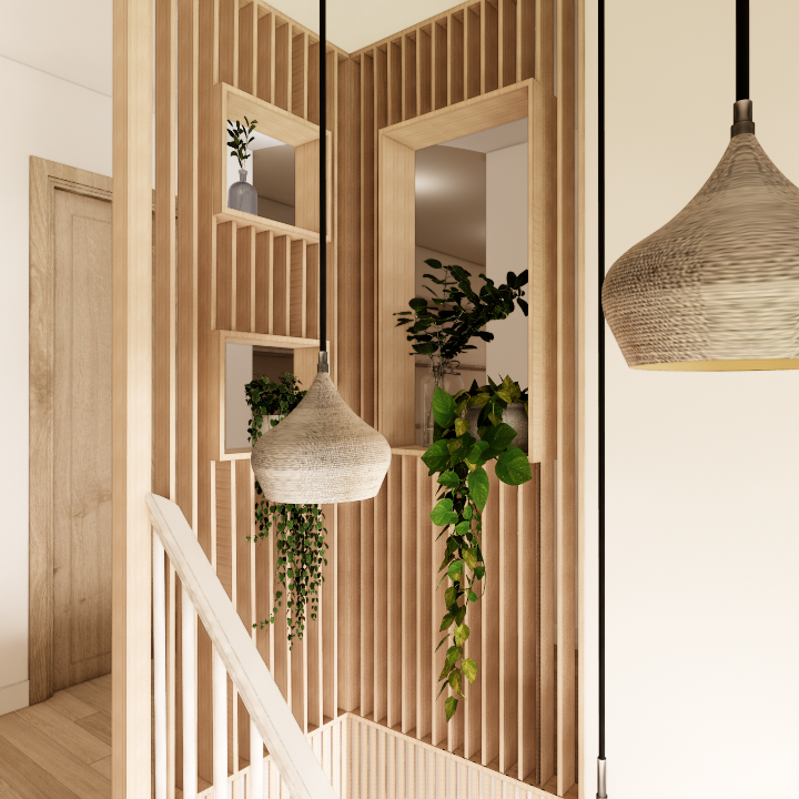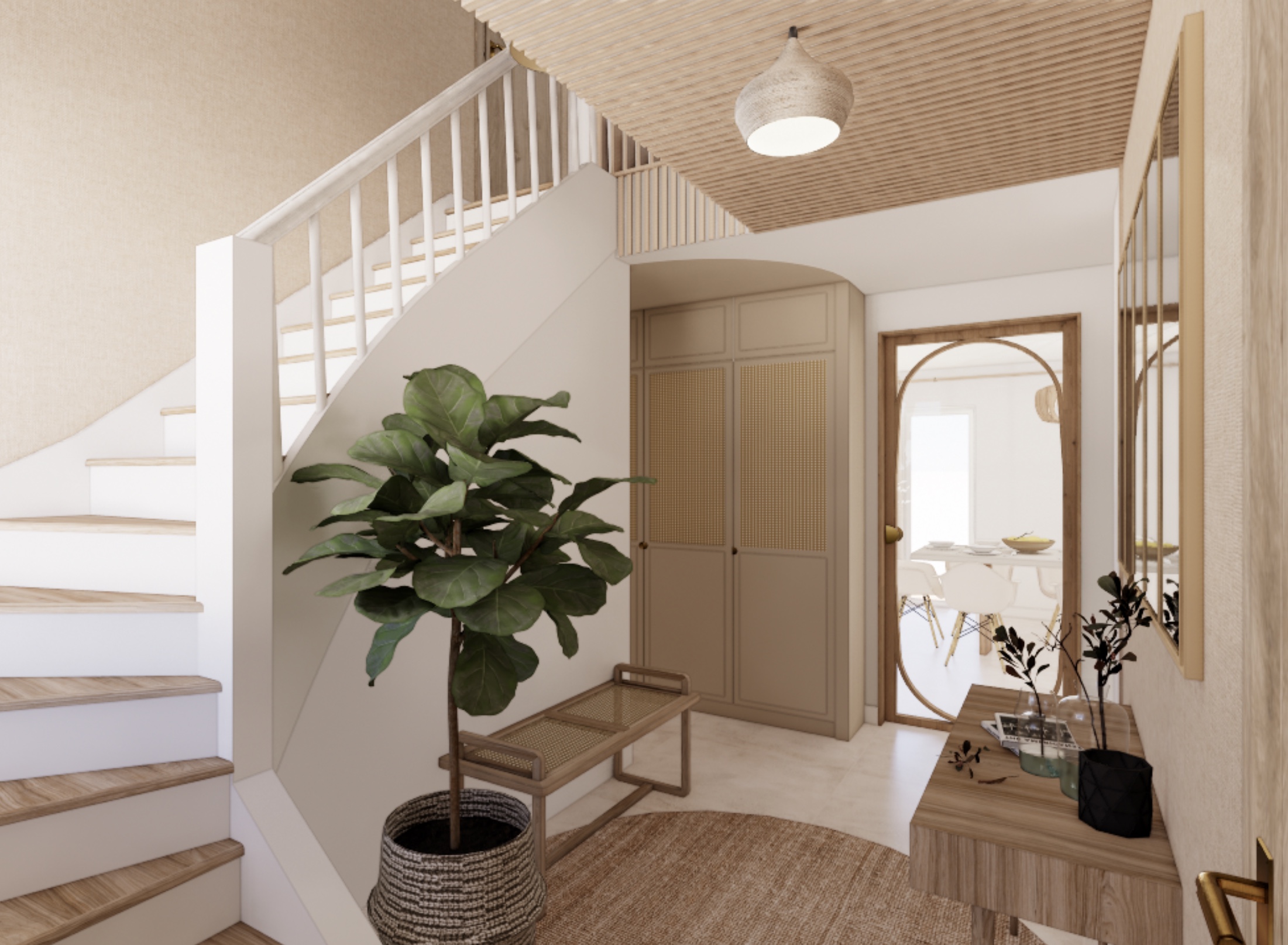 L’entrée devient un véritable espace d’accueil. L’escalier alsacien existant est conservé mais entièrement retravaillé : les marches en bois sont poncées et lasurées tandis que les contremarches et le garde-corps sont repeints dans des tons neutres. L’espace est enveloppé par un travail de tasseaux en plafond qui se prolongent dans la double hauteur de l’escalier, créant une atmosphère chaleureuse et structurante dès l’arrivée dans la maison. Les circulations sont également redéfinies par des portes vitrées en arche. Elles permettent de conserver une continuité visuelle et lumineuse tout en offrant la possibilité d’isoler les espaces lorsque cela est nécessaire.