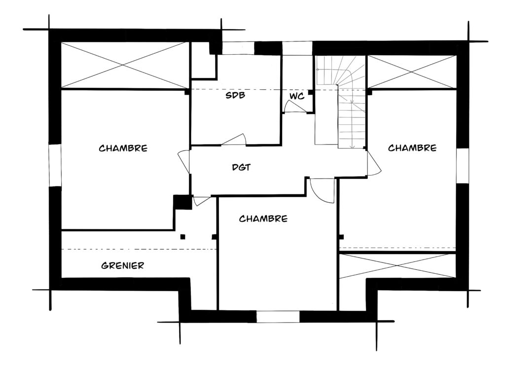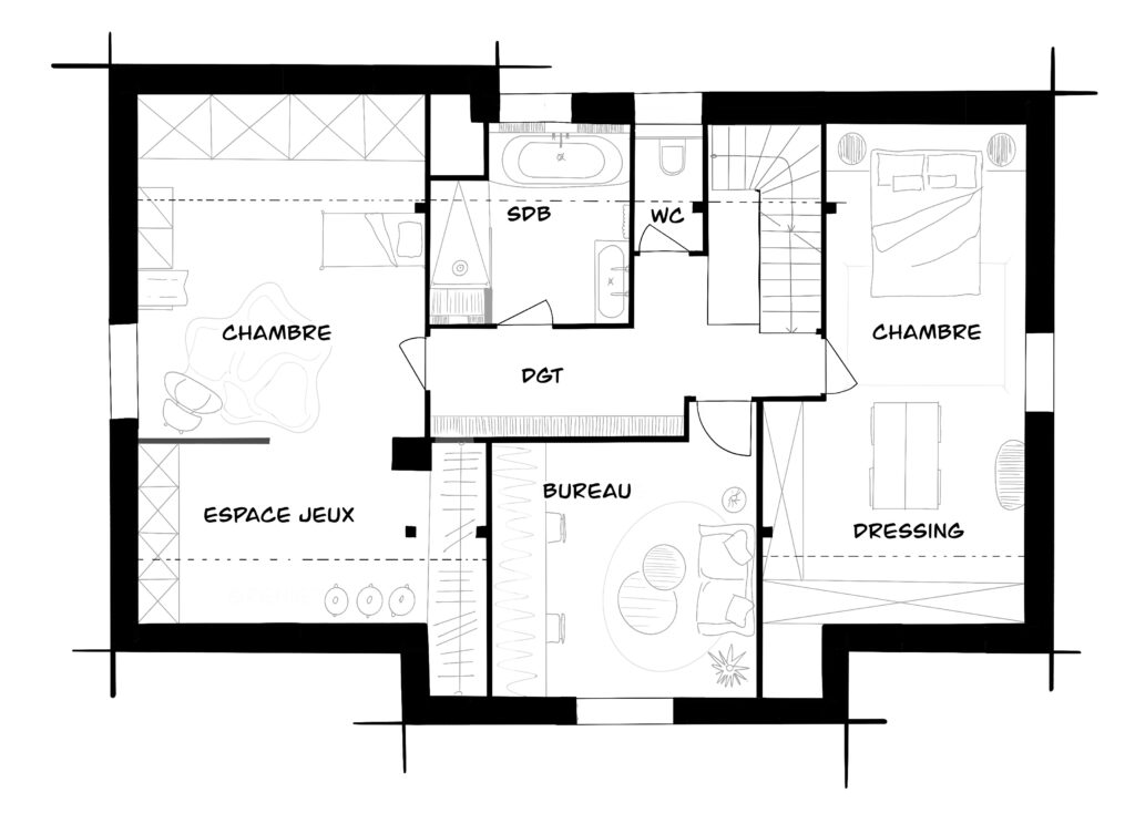 À l’étage, les combles sont réorganisés afin d’optimiser chaque volume sous pente. Les chambres intègrent des rangements et des dressings sous rampants afin de maximiser l’espace disponible. Une chambre enfant est accompagnée d’un espace de jeu installé dans l’ancien grenier, conçu pour évoluer avec le temps et devenir à terme un espace dressing ou une extension de la chambre. La salle de bain familiale est repensée pour répondre aux usages du quotidien : baignoire sous pente, douche et double vasque, tout en conservant les volumes existants.