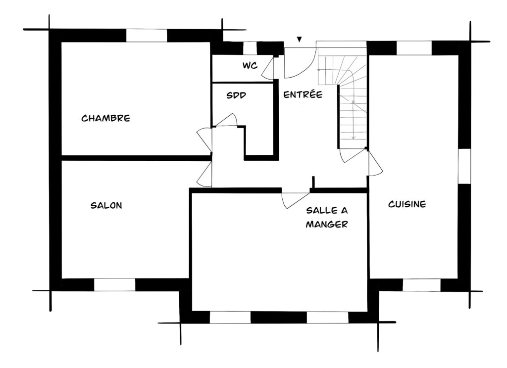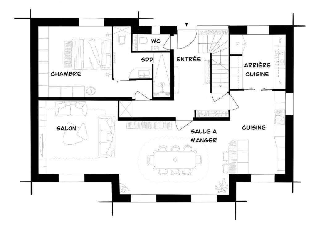 Le logement présentait une organisation très cloisonnée et peu adaptée au quotidien. L’enjeu du projet était donc de réorganiser les espaces de vie tout en conservant les murs porteurs existants, une contrainte importante formulée dès le départ par les propriétaires. La réflexion s’est ainsi appuyée sur une relecture du plan existant afin de retrouver fluidité, lumière et convivialité, tout en valorisant les volumes de la maison.